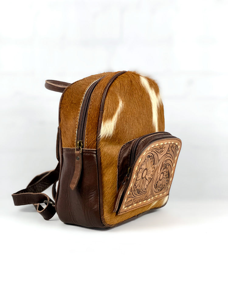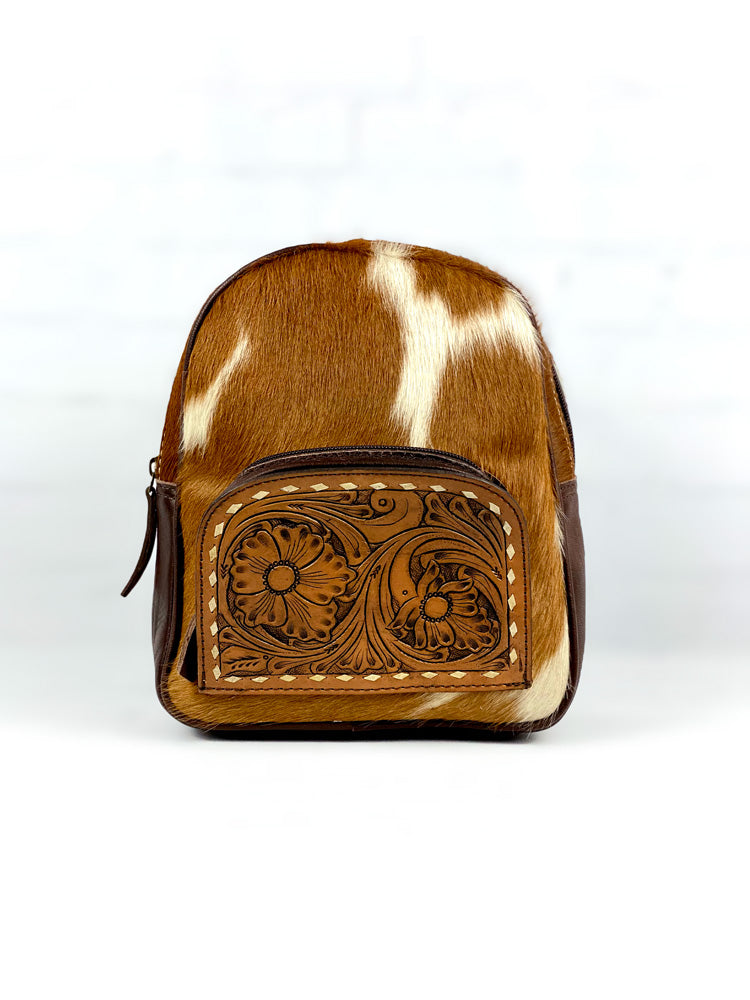Introducing our Mini Backpack Purse, a compact yet stylish accessory crafted from premium cowhide and genuine leather. This versatile bag features a beautifully tooled leather front pocket that adds a touch of Western elegance. With several smaller pockets both inside and out, it offers ample storage for all your essentials while maintaining a sleek profile. There is even a zipper pocket on the back to store your most important items with more security. The adjustable leather straps ensure a comfortable fit, making it perfect for on-the-go convenience. Whether you're heading out for a day in the city or a night on the town, this miniature backpack purse combines functionality with classic Western charm.